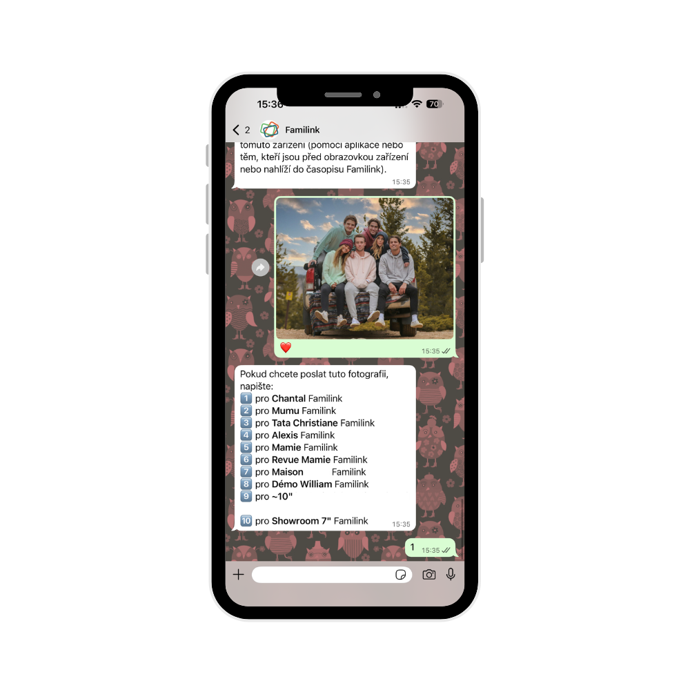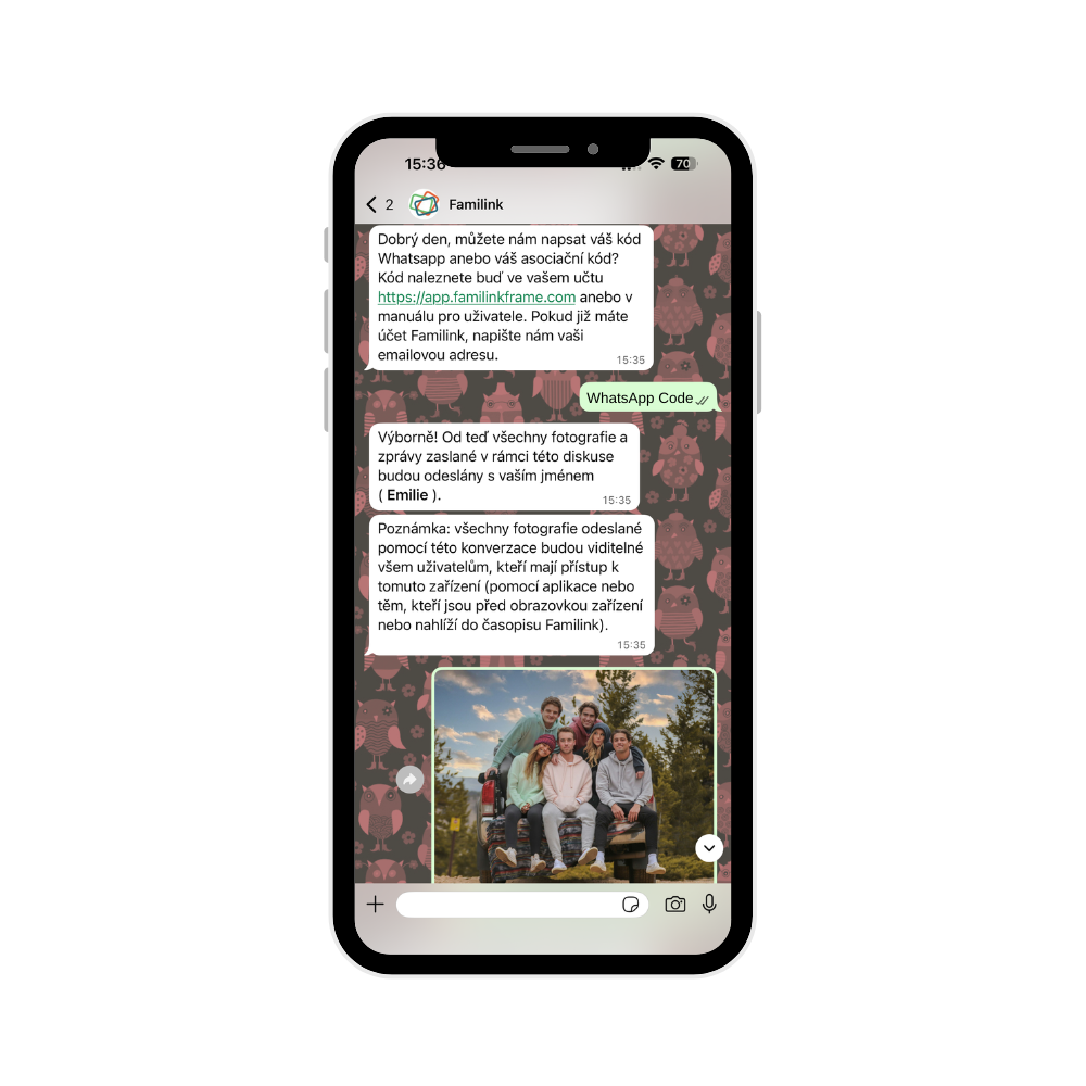 Familink je propojen s aplikací WhatsApp, aby vám usnadnil odesílání fotografií do fotorámečků Familink. Tato funkce je zcela zdarma a volitelná.