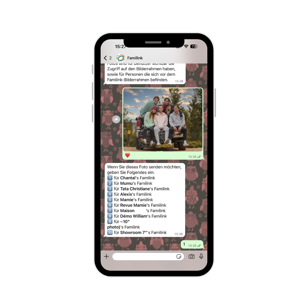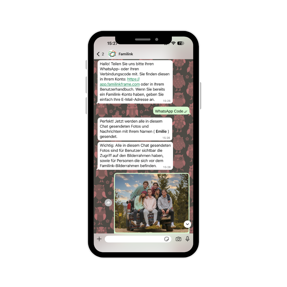 Familink ist mit WhatsApp verbunden, sodass Sie ganz einfach Fotos/Videos an Ihren Familink-Fotorahmen senden können. Diese Funktion ist optional und kostenlos.