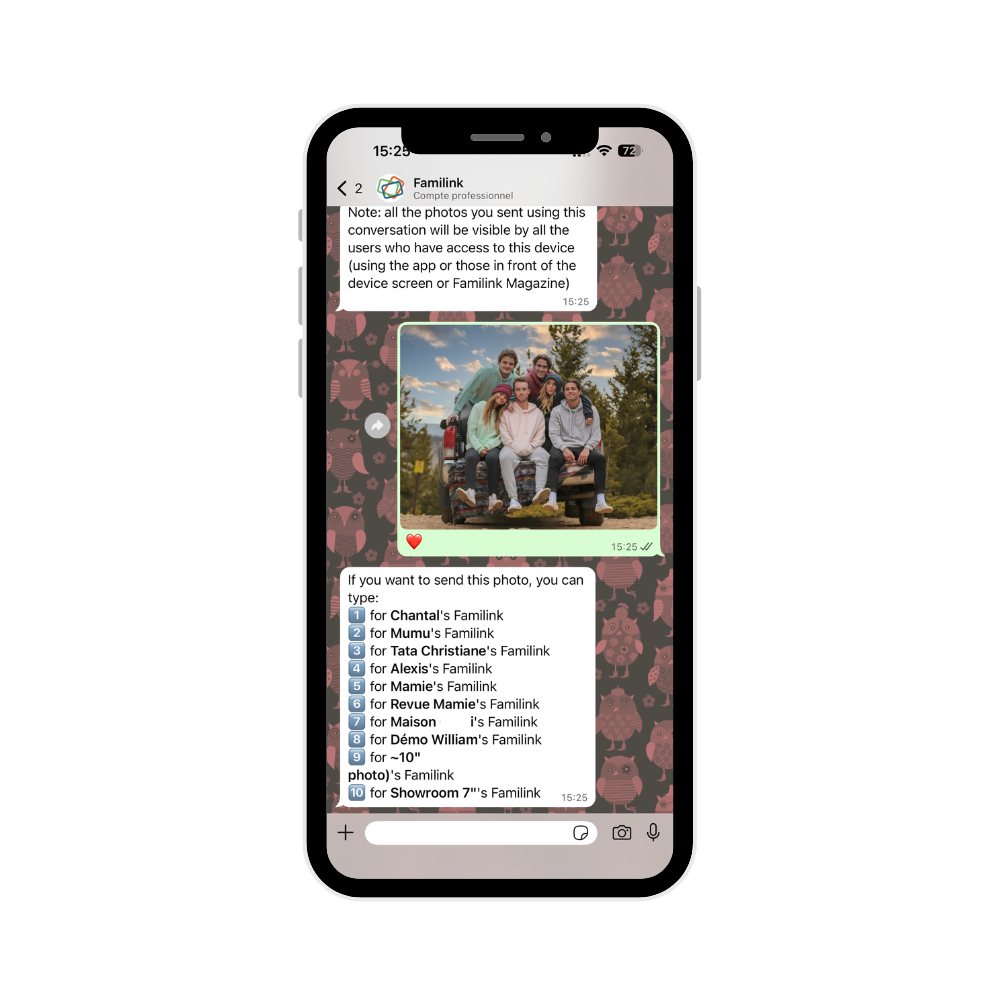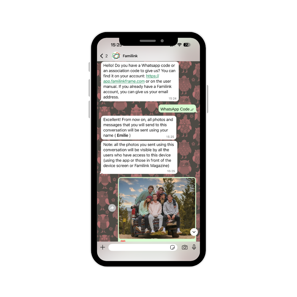 Familink is connected to WhatsApp, making it easy to send photos to your Familink photo frames. This feature is free and optional.