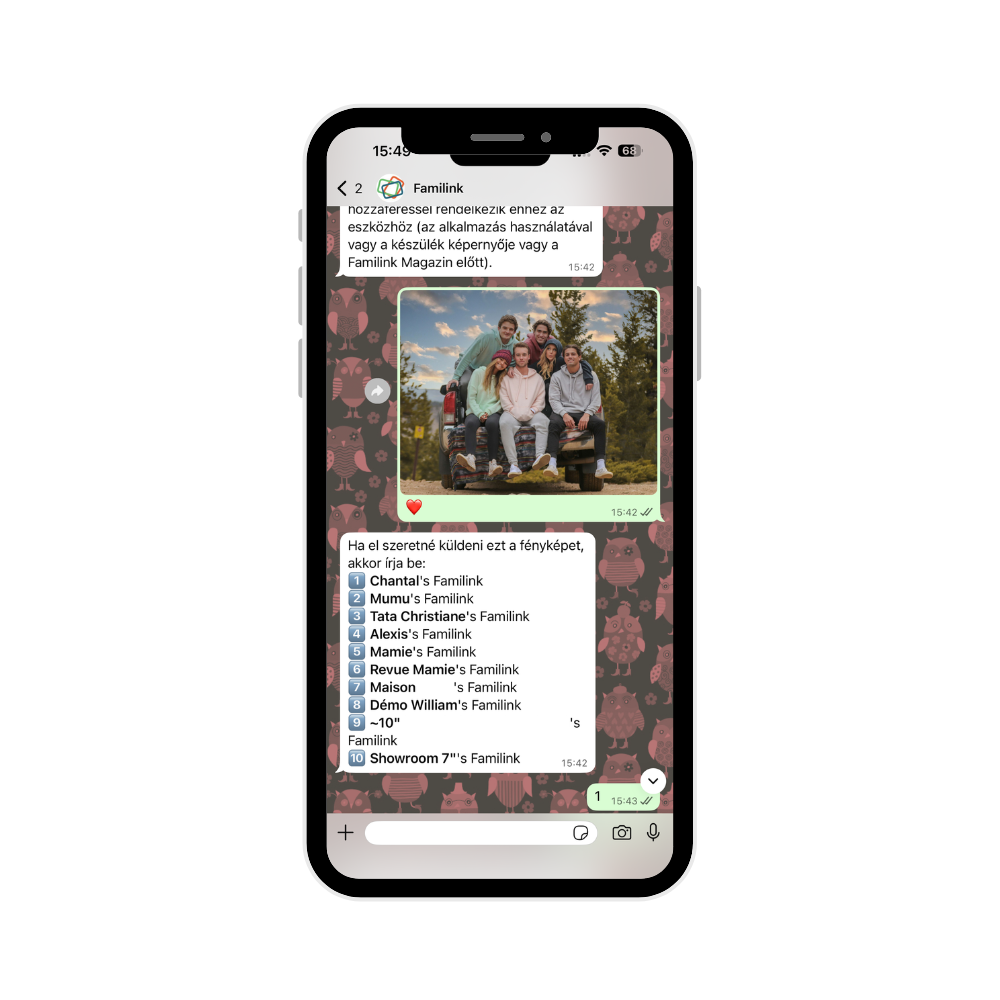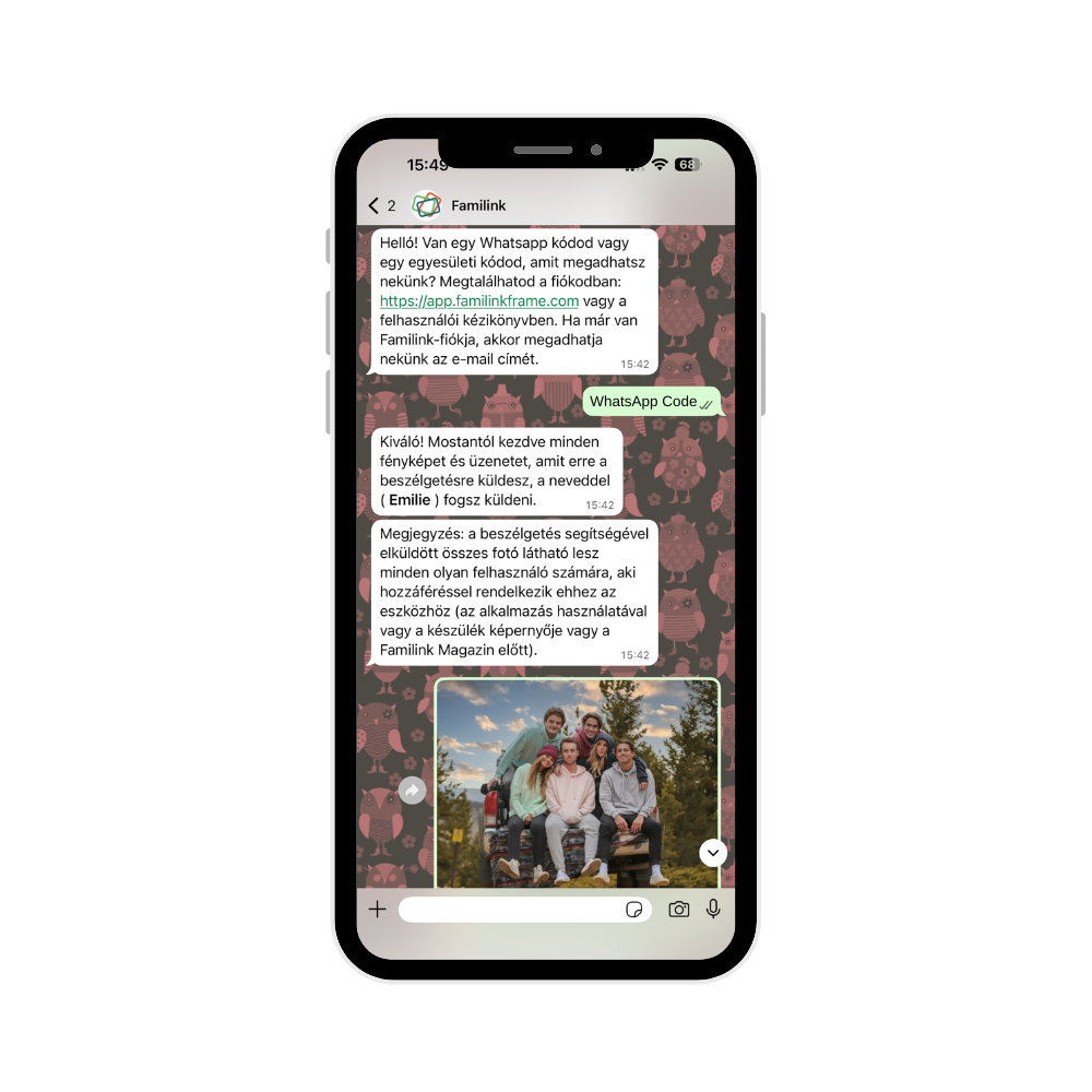 A Familink összekapcsolható a WhatsApp-pal, így még egyszerűbbé válik a fotók és videók küldése a Familink keretekre. Ez a funkció teljesen ingyenes és választható.