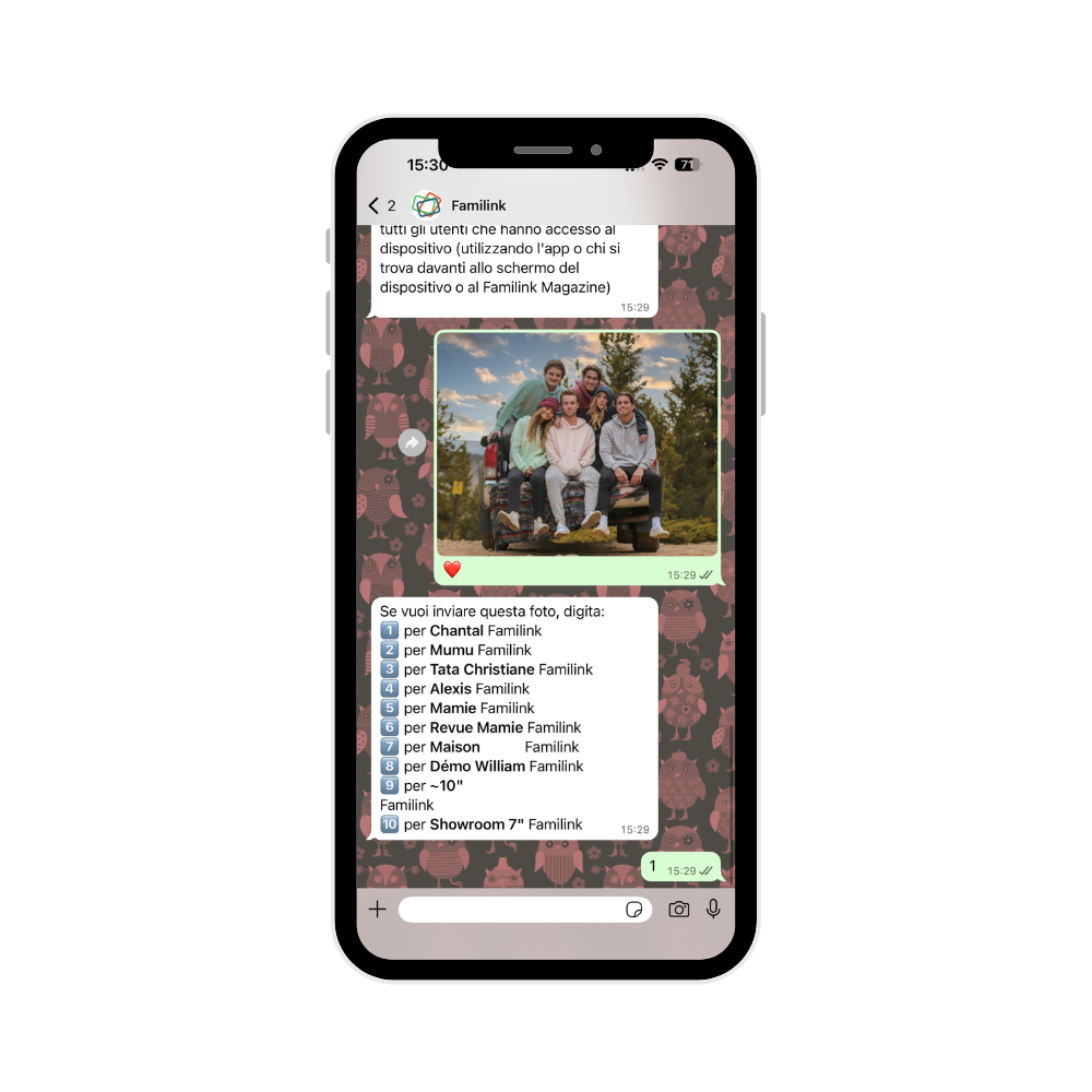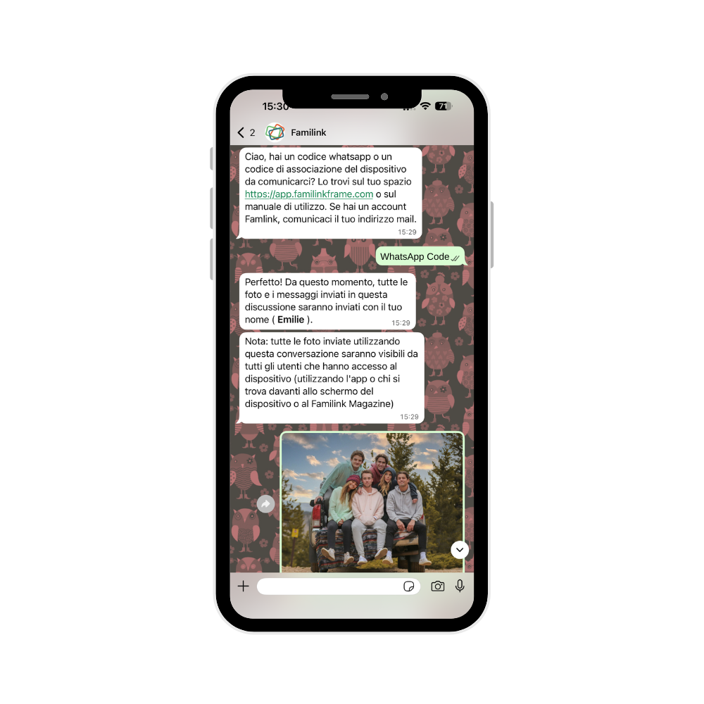 Familink è collegato a WhatsApp per facilitare l'invio di foto e video alle cornici Familink. Questa funzione è completamente gratuita e facoltativa.
