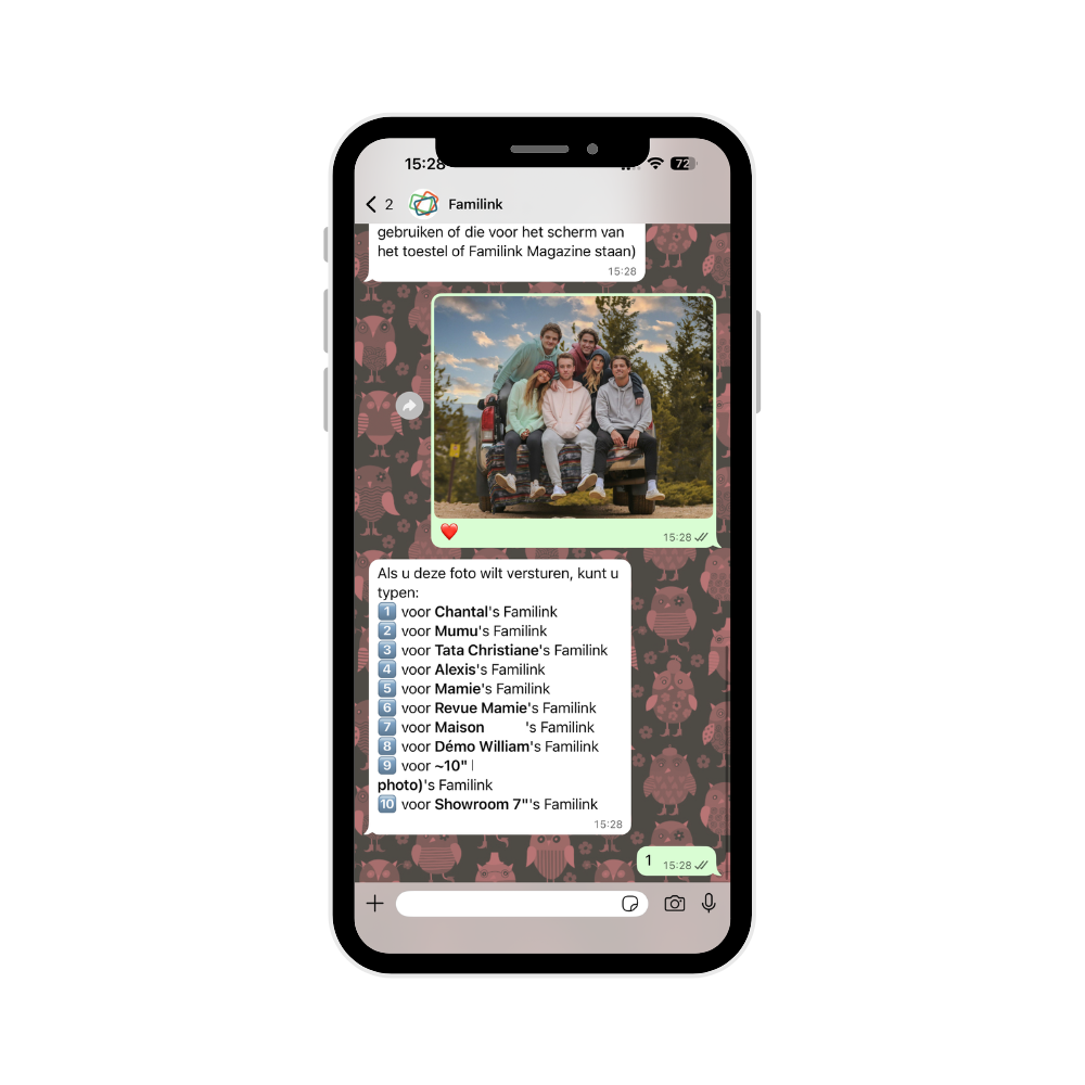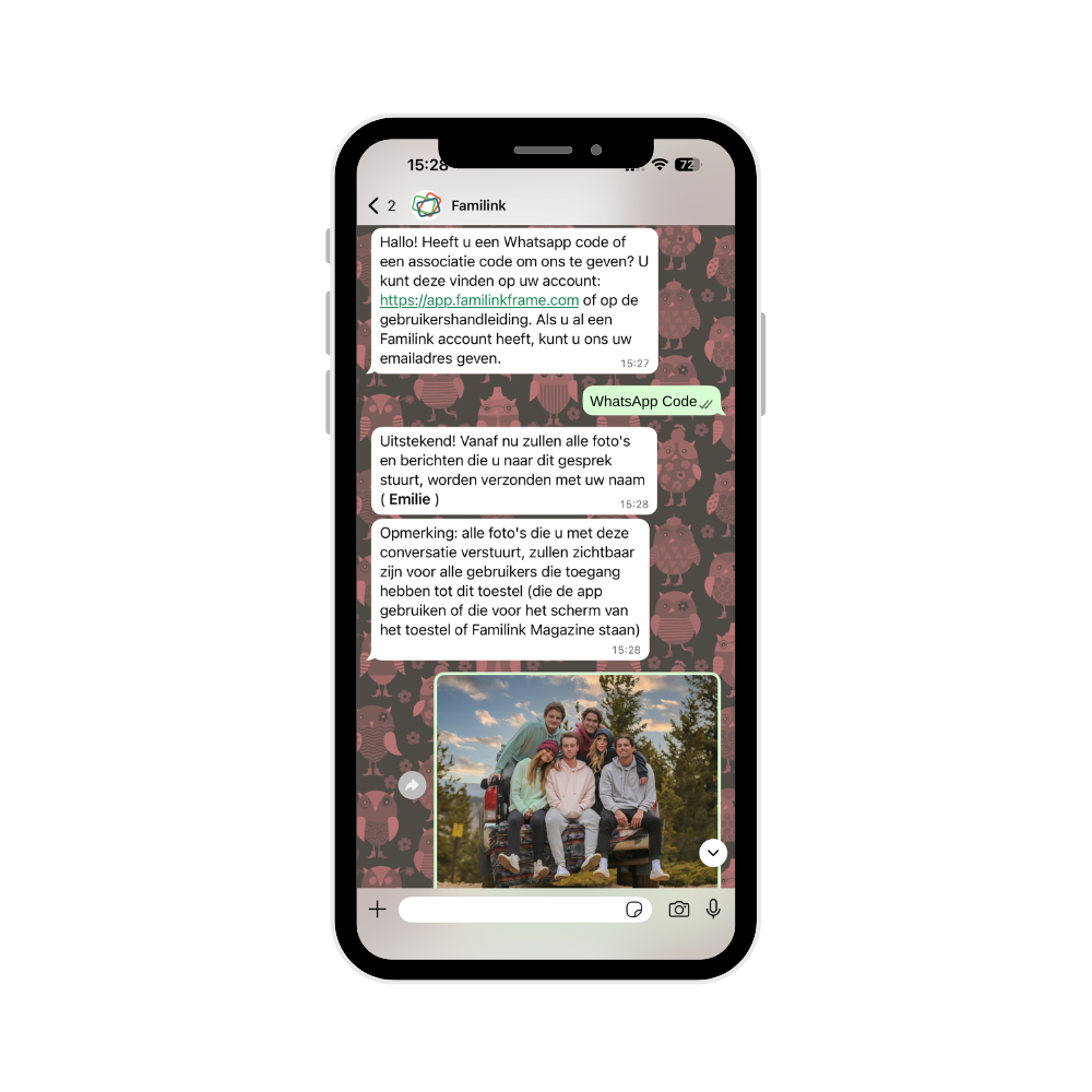Familink is gekoppeld aan WhatsApp, zodat u gemakkelijk foto's en video's naar Familink-fotolijsten kunt sturen. Deze functie is volledig gratis en optioneel.