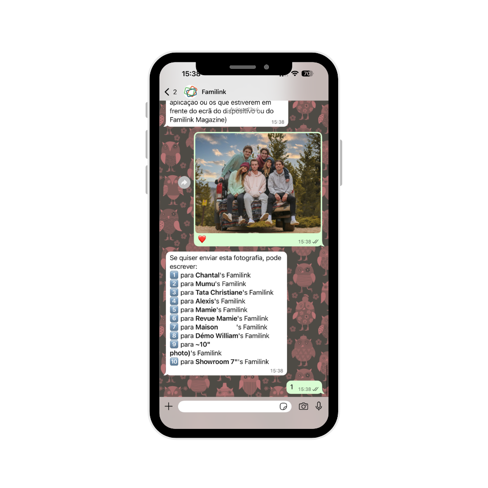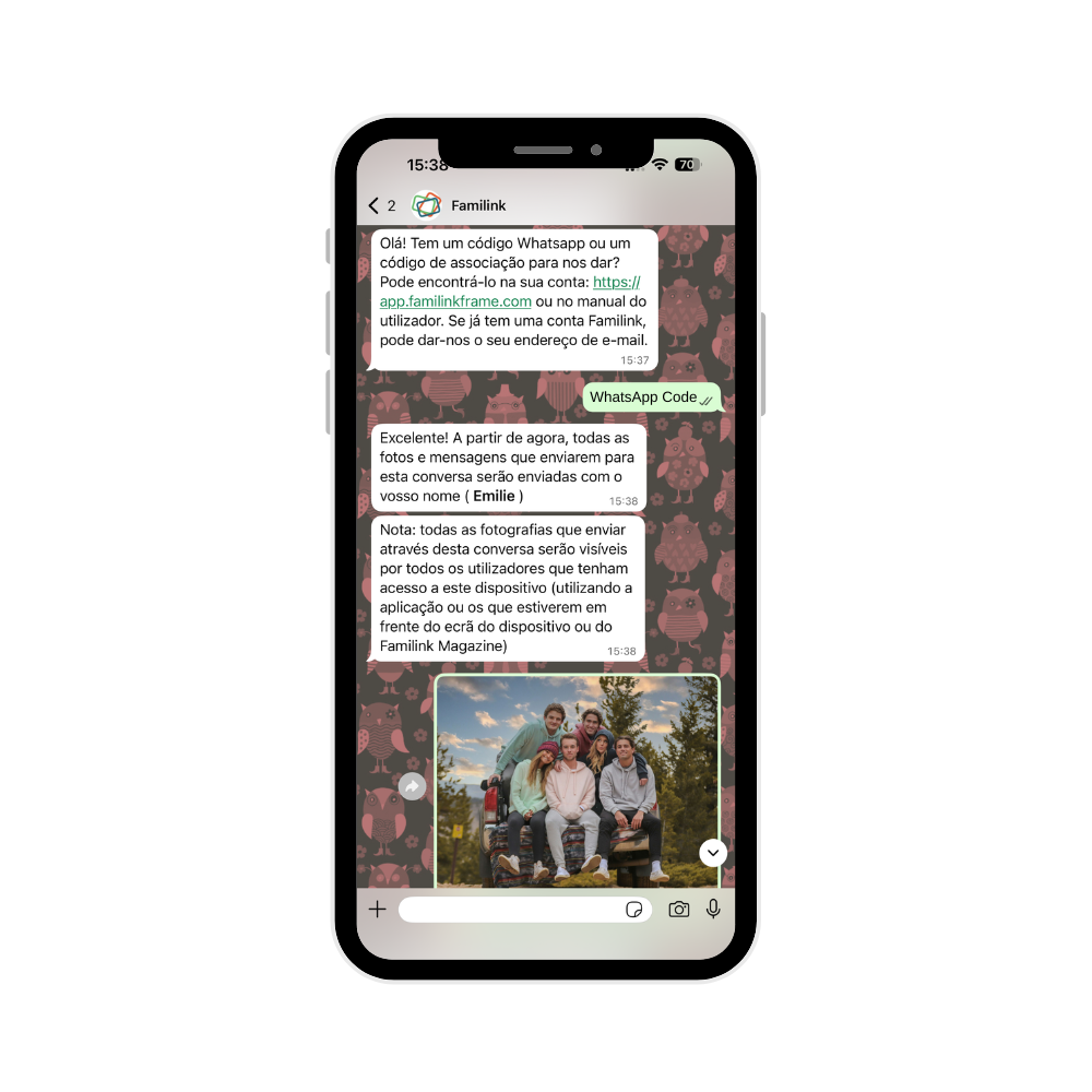 O Familink está ligado ao WhatsApp para facilitar o envio de fotos e vídeos para os quadros Familink. Esta funcionalidade é totalmente gratuita e opcional.
