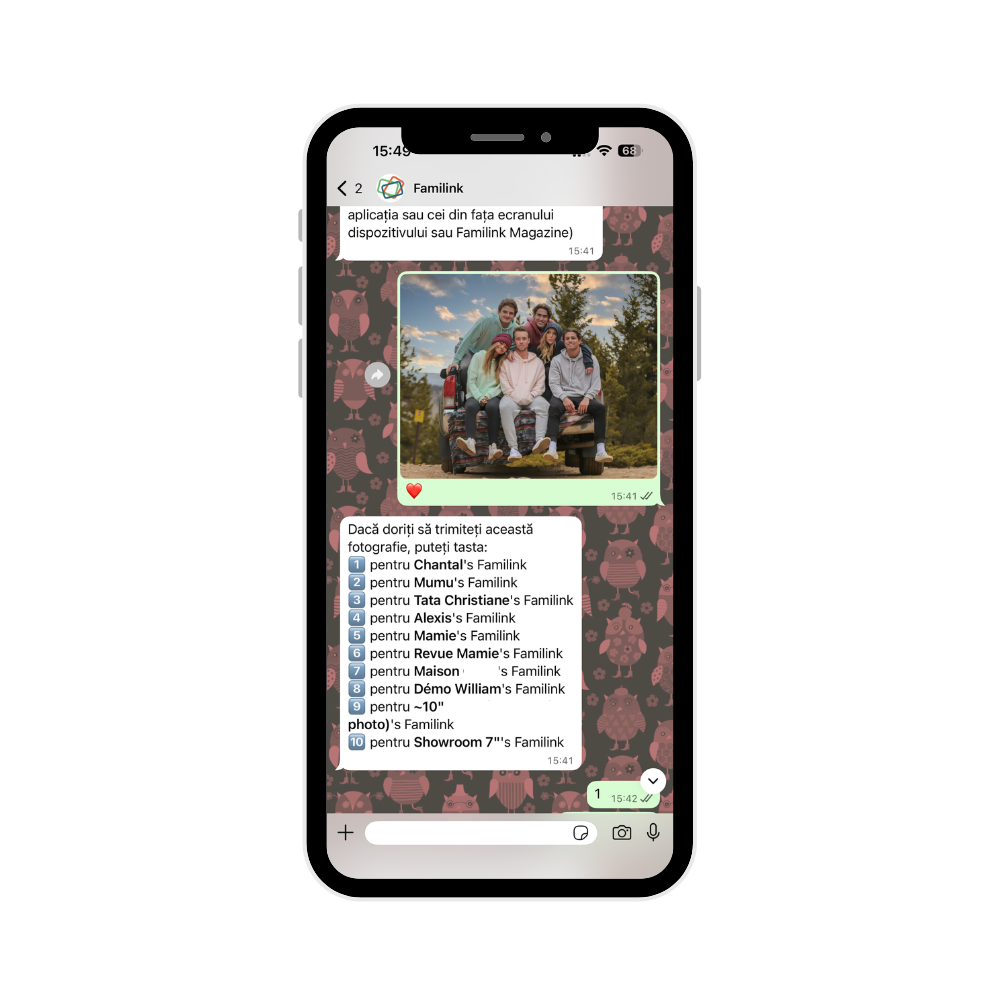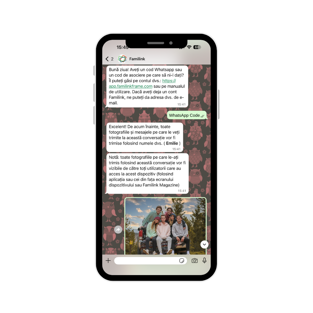 Familink este conectat la WhatsApp, facilitând trimiterea fotografiilor către ramele foto Familink. Această funcție este gratuită și opțională.